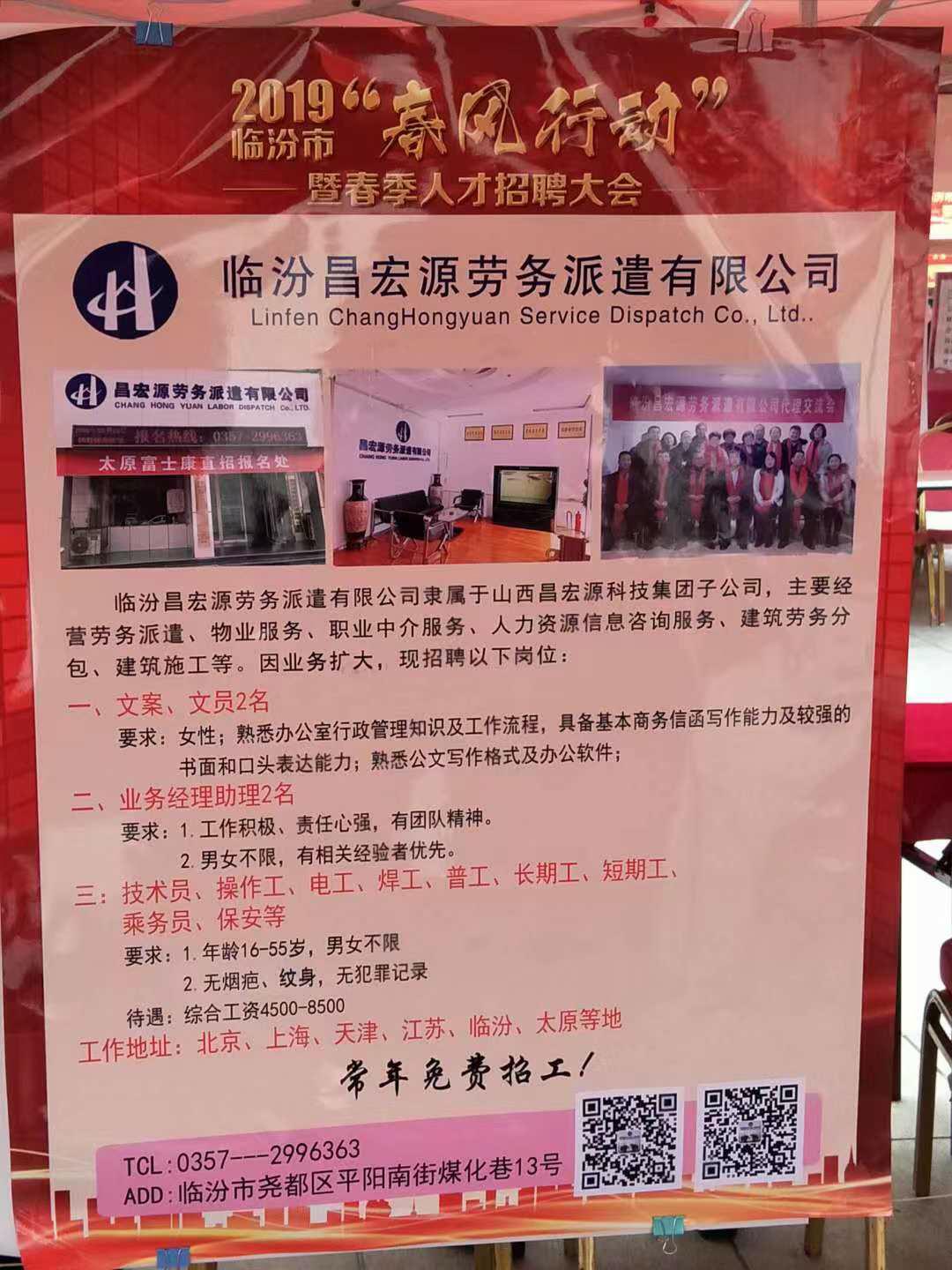 近日,昌宏源勞務(wù)派遣有限公司分別在臨汾市九州廣場(chǎng)和襄汾丁陶廣場(chǎng)舉辦了“2019年春季人才招聘會(huì)”,公司全體員工參與了本次招聘會(huì)。