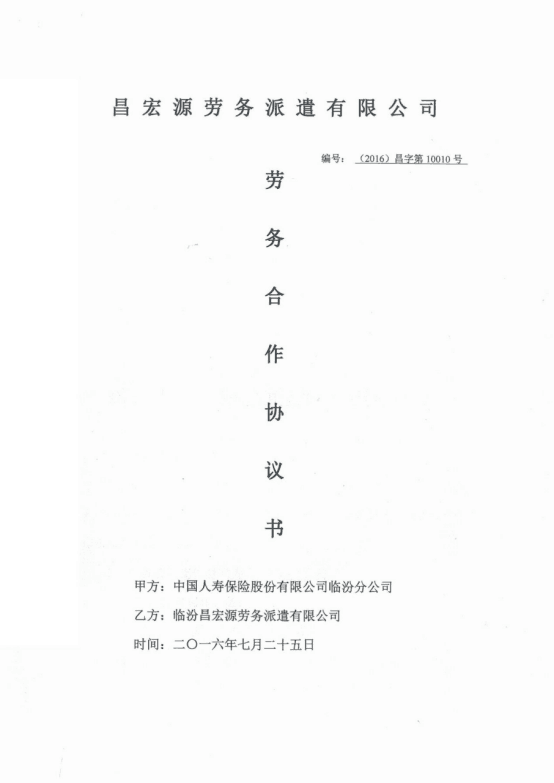熱烈祝賀!臨汾昌宏源勞務(wù)派遣有限公司2016年7月25日在中國(guó)人壽保險(xiǎn)股份有限公司臨汾分公司服務(wù)項(xiàng)目中成功合作。