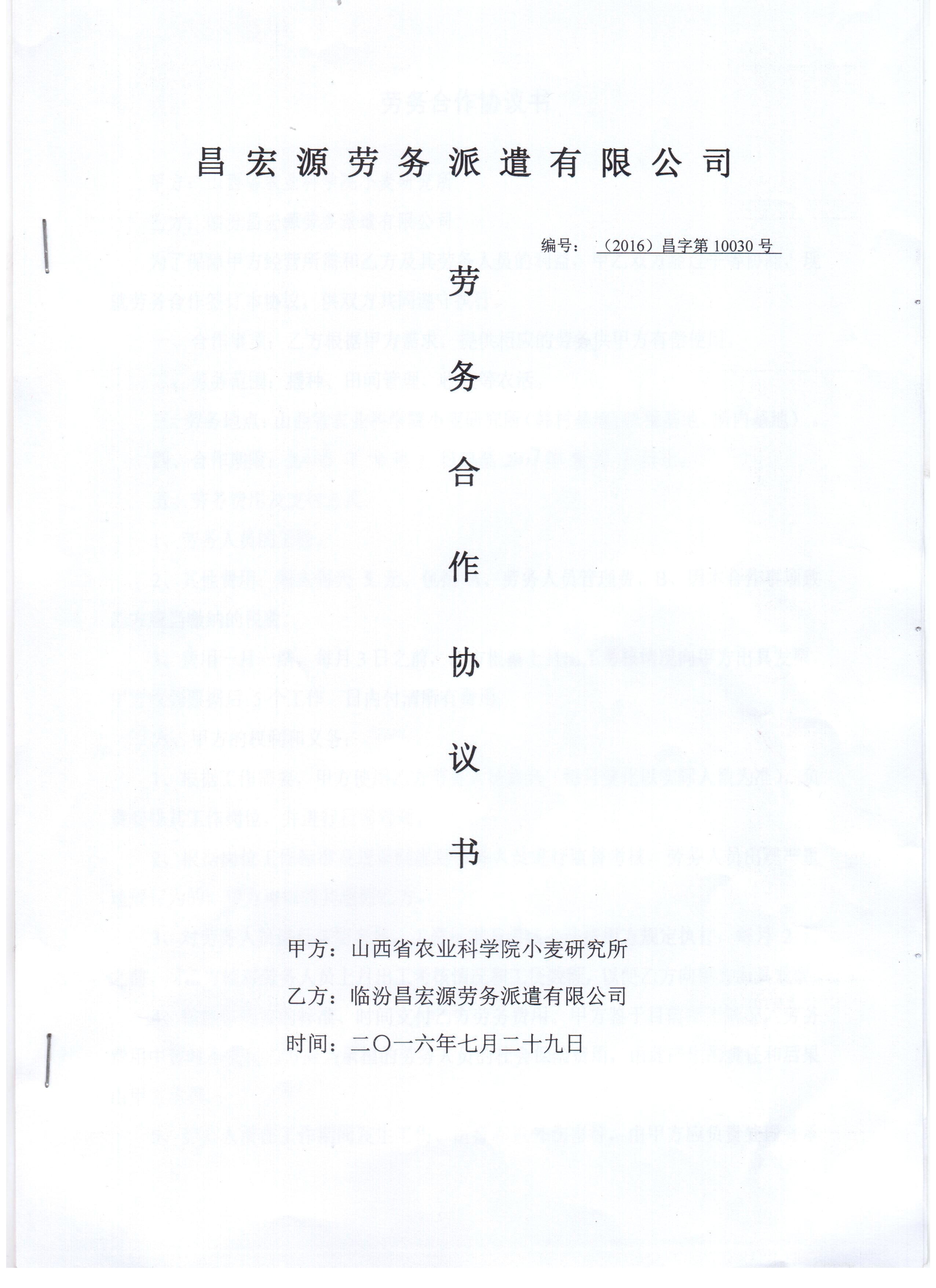 熱烈祝賀!臨汾昌宏源勞務派遣有限公司2016年7月29日與山西省農(nóng)業(yè)科學院小麥研究所成功合作。