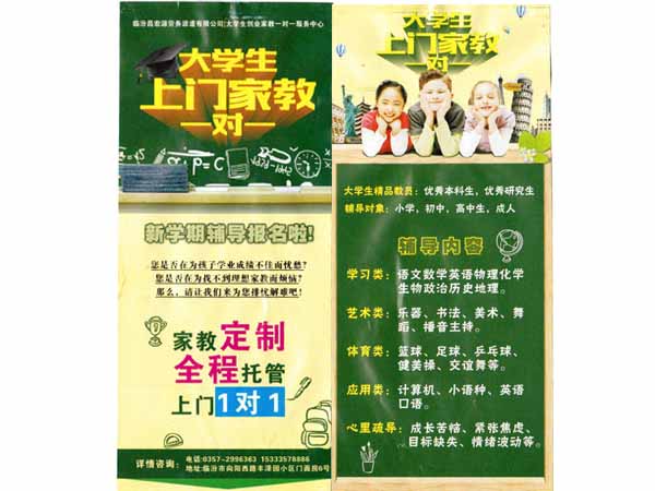 本公司常年進行”一對一“小、中、高文化課和特長等的輔導(dǎo)。我們公司薈萃了優(yōu)質(zhì)教師及各個名校大學(xué)生,幫助各年級學(xué)生在短時間內(nèi)掌握正確的學(xué)習(xí)方法,大幅度提高學(xué)習(xí)成績,并養(yǎng)成良好的學(xué)習(xí)習(xí)慣。