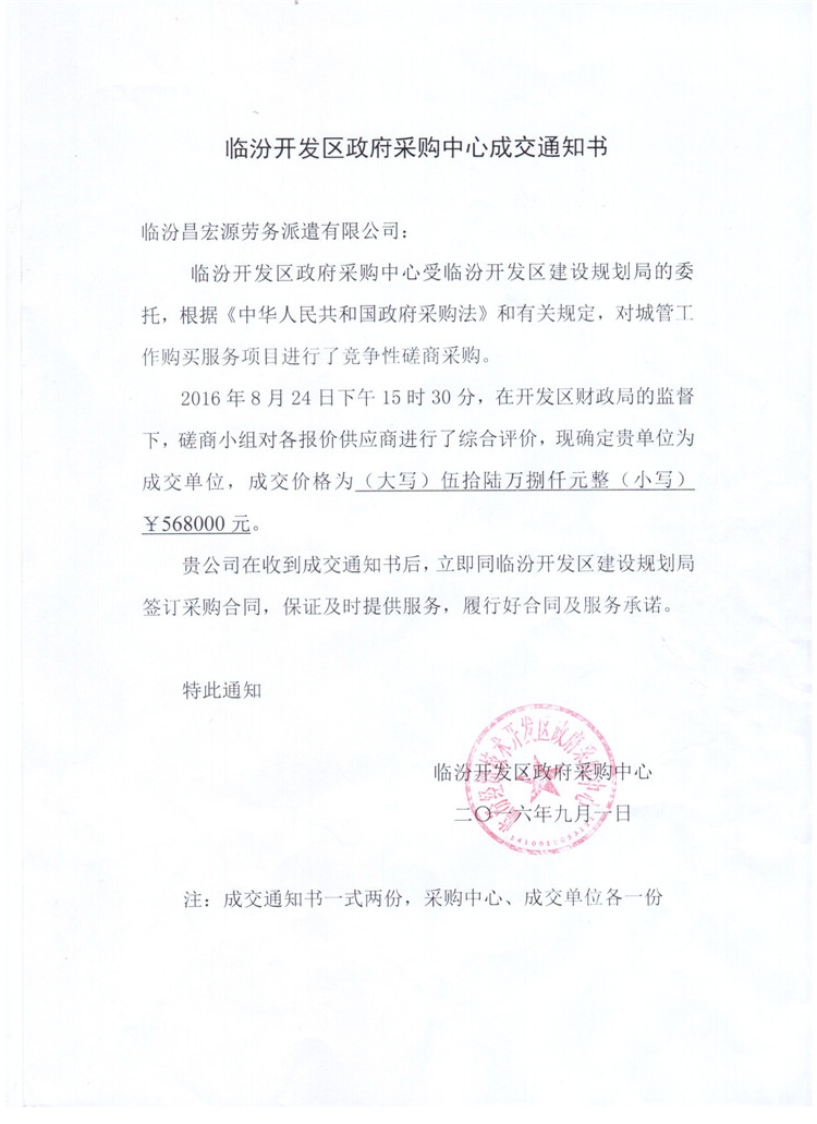 熱烈祝賀!臨汾昌宏源勞務(wù)派遣有限公司2016年8月24日在臨汾開發(fā)區(qū)建設(shè)規(guī)劃局服務(wù)項目中成功中標。