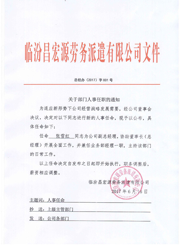 關(guān)于部門人事任職的通知